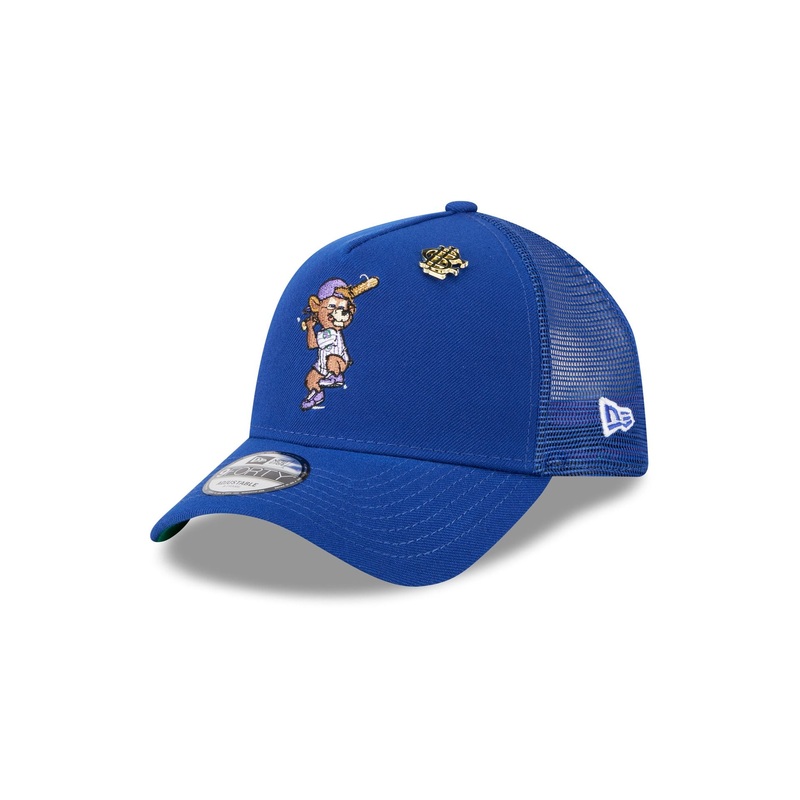 The Big League Chew x Chicago Cubs 9FORTY A-Frame Trucker features an embroidered Cubs mascot and a Big League Chew pin at the front panel with an adjustable snapback closure at the rear and green undervisor.