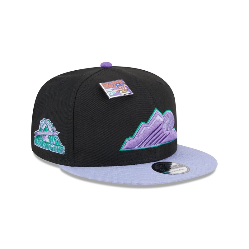 The Big League Chew X Colorado Rockies Grape 9FIFTY Snapback features an embroidered Rockies logo and a Big League Chew Grape pin at the front panels with a purple visor and a gray undervisor. Additional details include a 1998 All Star Game patch at the right-wear side and a Big League Chew logo to the right of the snapback closure at the rear.