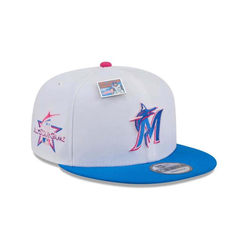 The Big League Chew X Miami Marlins Cotton Candy 9FIFTY Snapback features an embroidered Marlins logo and a Big League Chew Cotton Candy pin at the front panels with a blue visor and a gray undervisor. Additional details include a 2017 All Star Game patch
