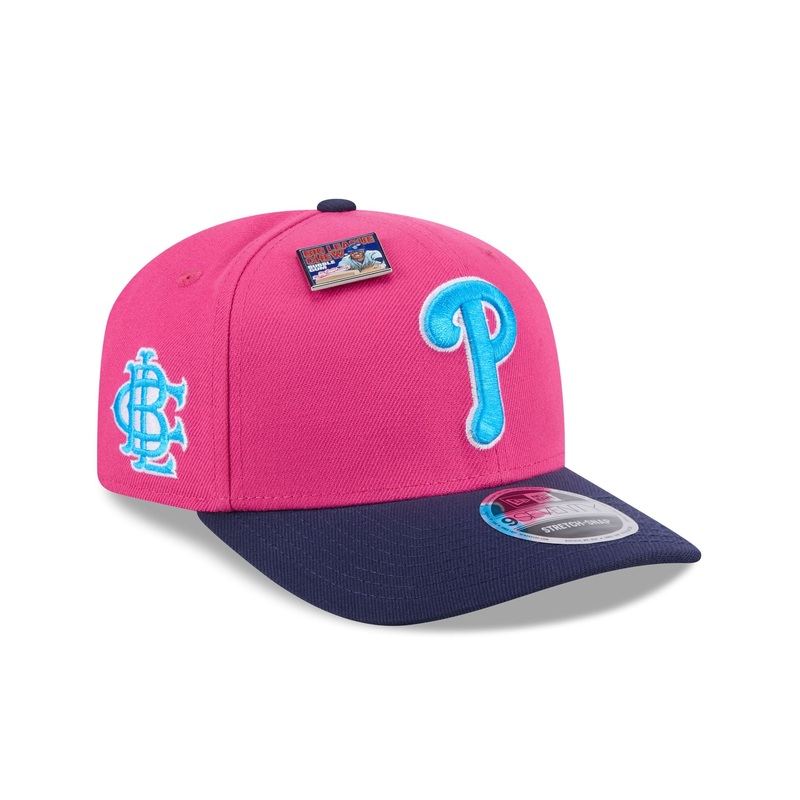 The Big League Chew X Philadelphia Phillies Big Rally Blue Raspberry 9SEVENTY Stretch-Snap features an embroidered Phillies logo and a Big League Chew Big Rally Blue Raspberry pin at the front panels. Additional details include a Big League Chew logo at the right-wear side, a navy visor, and gray undervisor.