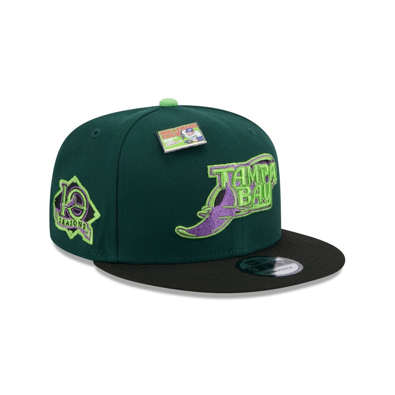 The Big League Chew X Tampa Bay Rays Sour Apple 9FIFTY Snapback features an embroidered Rays Cooperstown logo and a Big League Chew Sour Apple pin at the front panels with a black visor and a gray undervisor. Additional details include a 10 Seasons patch a