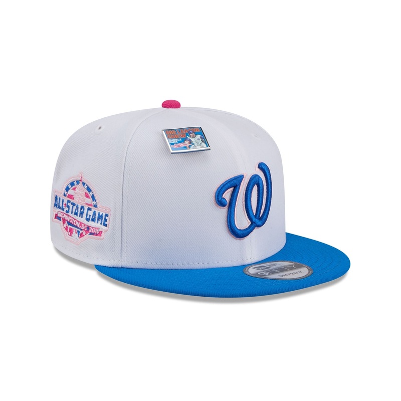 The Big League Chew X Washington Nationals Cotton Candy 9FIFTY Snapback features an embroidered Nationals logo and a Big League Chew Cotton Candy pin at the front panels with a blue visor and a gray undervisor. Additional details include a 2018 All Star Game patch at the right-wear side and a Big League Chew logo to the right of the snapback closure at the rear.