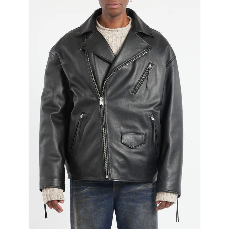Biker jacket is crafted from waxy leather, detailed with an Acne Studios trademark logo embossed on the cuff. Cut to a relaxed fit with extra long sleeves and below hip length.Notch lapel with snap buttonAsymmetric front zipper closureZipper pockets at the