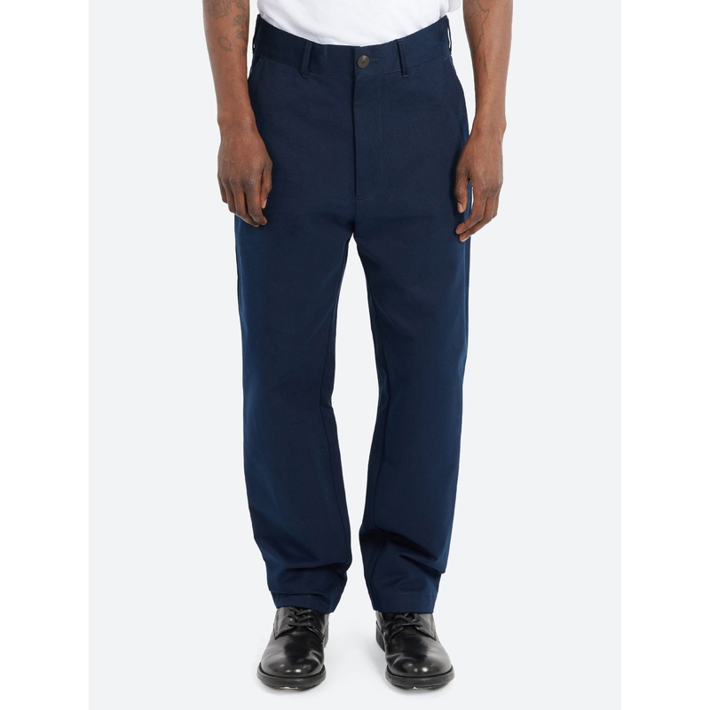 High-waisted flat front pant made from Studio Nicholson's signature Italian peached cotton.Internal jigger buttonConcealed zip fly with rubberized button closureBelt loopsTwo hand pocketsTwo rear patch pocketsStraight legMaterialsFabric Content: 100% cotto