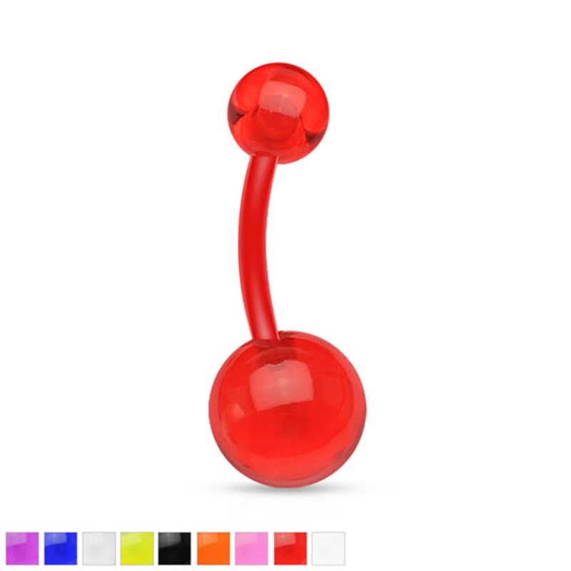 The 14 gauge belly ring is made from bioflex plastic with external threading. Both 5mm and 8mm basic acrylic ball ends are removable. These cannot be autoclaved. Choose your color below.