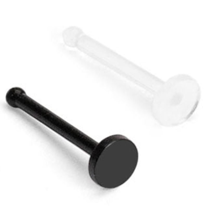 The bioflex nose bone retainer is 5/16″ long with a 2mm ball head. These are made to be inserted from the inside of your nostril, but many people wear the large disk facing out. These are an excellent short term solution for hiding your nostril piercing. These cannot be autoclaved. Choose your size and color below.