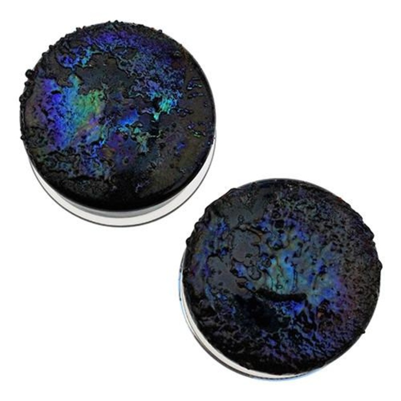 These double flare bismuth druzy plugs are made from hand blown borosilicate glass by glasswear studios. They have a wearable area of approximately 3/8″ between flares. Choose your size below.