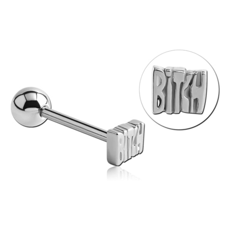 The 14 gauge “bitch” tongue barbell is made from 316L stainless steel with external threading.