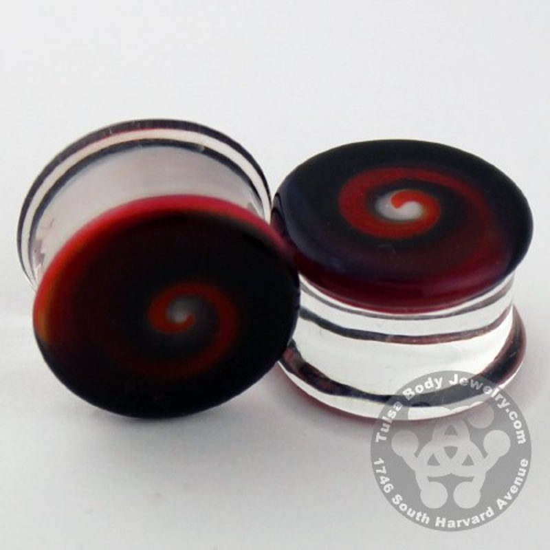 These double flareblack and blood swirl plugs are made from hand blown borosilicate glass by Glasswear Studios. They have a wearable area of approximately 3/8" between flares. Choose your size below.