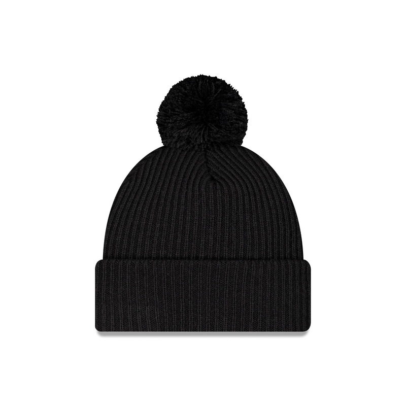 The Black Ribbed Pom Knit features an embroidered New Era New Era Flag at the left-wear side and a one-time removeable pom.