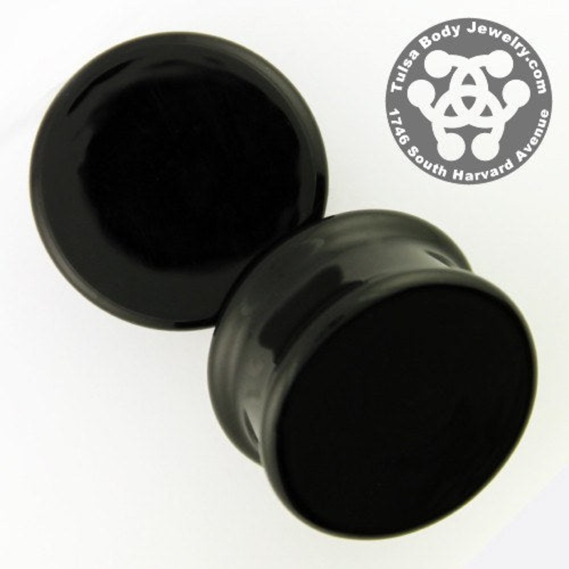These double flare black solid color plugs are made from hand blown borosilicate glass by Glasswear Studios. They have a wearable area of approximately 3/8" between flares. Choose your size below.