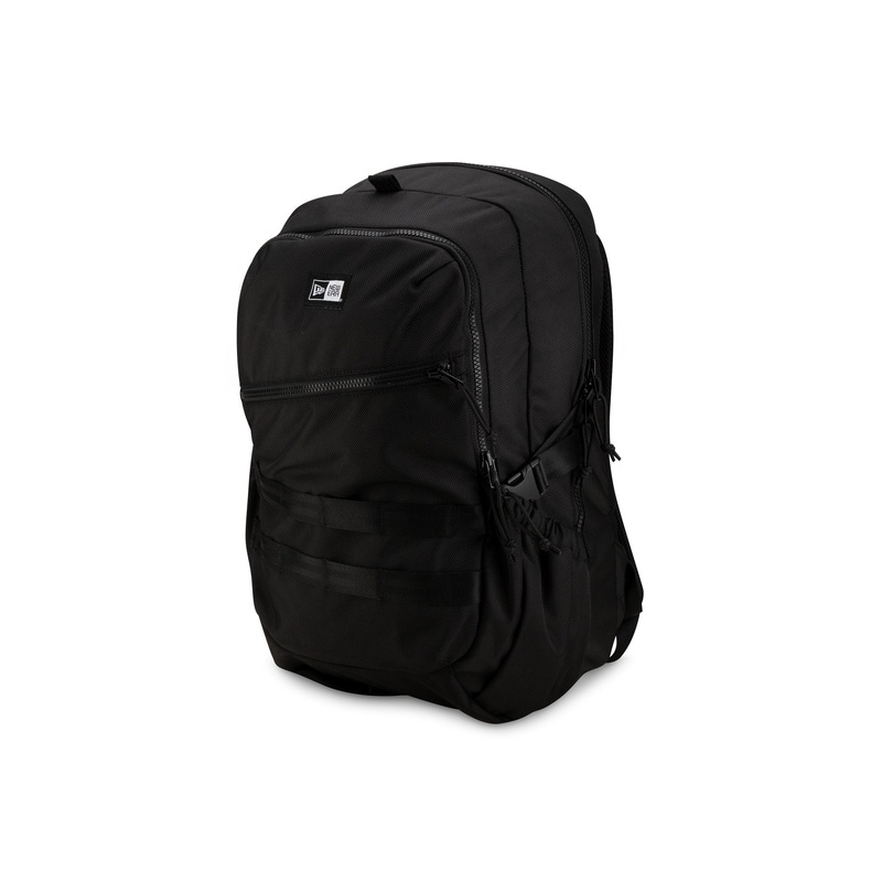 The Black Urban Pack features a woven New Era tag at the front with an embroidered New Era flag at the right-side water bottle storage pocket. Additional details include a weather-resistant TPU treated outer shell with multiple zip pockets throughout, a ke
