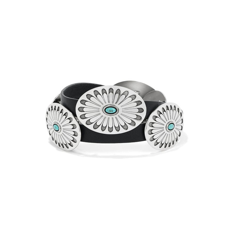 Handcrafted in Los Angeles using the finest materials sourced from around the world, this Latigo leather belt features sliding conchos with engraved filigrees and turquoise accents.