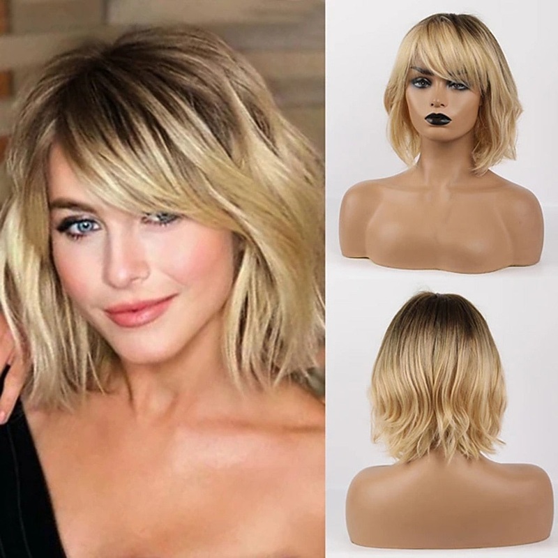 Blended Remy Hair Bob Wig with Bangs50% human hair & 50% high-quality synthetic fibresMedium Length 10 inchesAsymmetrical Side PartCap Size: Average SizeHair Grade: Remy HairStyle: Wavy