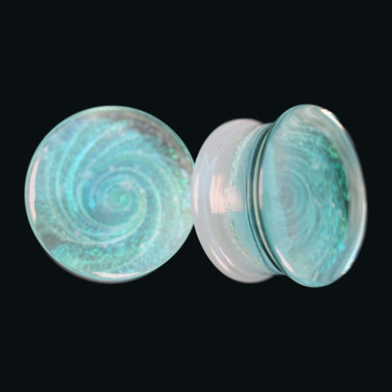 These double flare green dichroic blizzard plugs are made from hand blown borosilicate glass. They have a wearable area of approximately 3/8" between flares. Choose your size below.