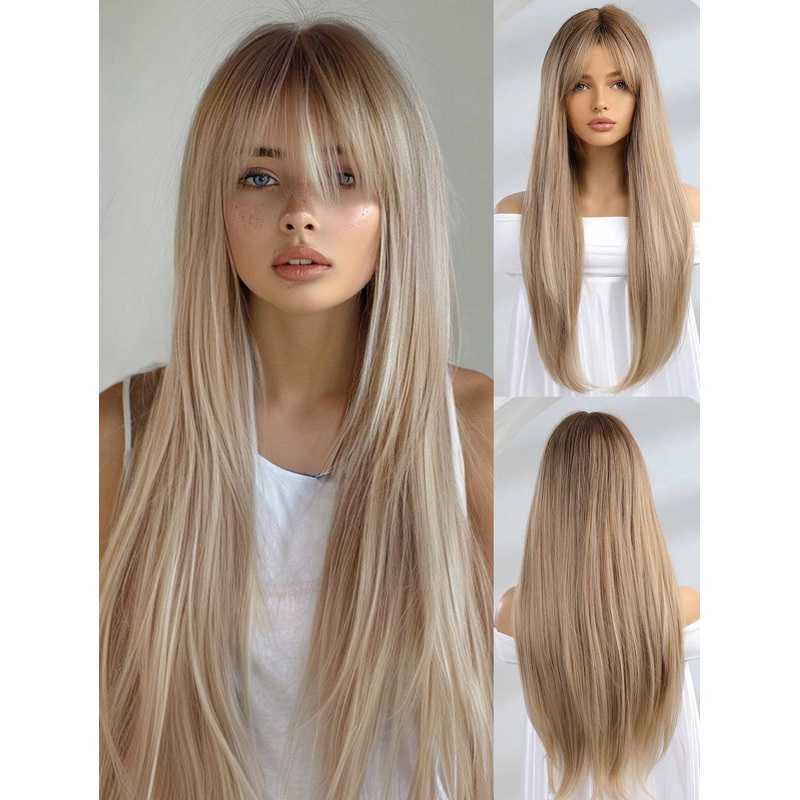 Blonde 26 Inch Gradient Straight Hair WigThis blonde 26-inch gradient straight hair wig with bangs is made of high-quality synthetic fiber, perfect for women and girls looking for a stylish and comfortable hair replacement solution. The wig features a natu