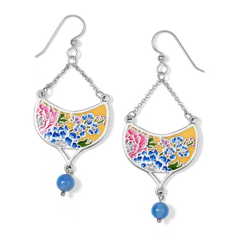 A hand-drawn, hand-enameled pattern with a colorburst of florals decorates these teardrop-shaped earrings and semi-precious lapis beads dangle beautifully from them.