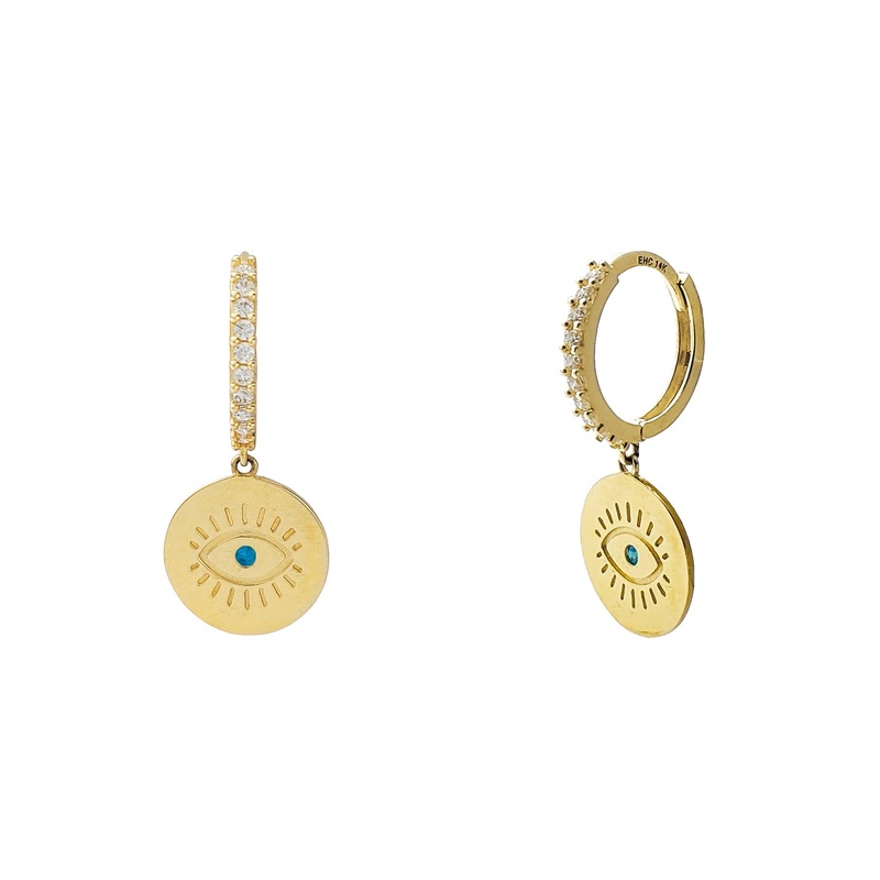 Earring Back Type:LatchBackPrecious Metal: 14 Karat YellowGoldGemstones:Cubic ZirconiaRound Shaped: WhiteStones may be upgraded upon request.Overhanging Height:25.5 mm*Evil Eye Diameter:11.1 mm*Approx. Weight: ~2.4grams**All weights and measurements are ap