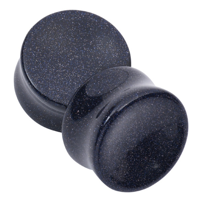 These double flare concave blue goldstone plugs have a wearable area of 3/8" between flares. Blue Goldstone is actually a type of glass that frequently gets lumped into the stone category. In traditional jewelry making, it's interchanged with semi-precious