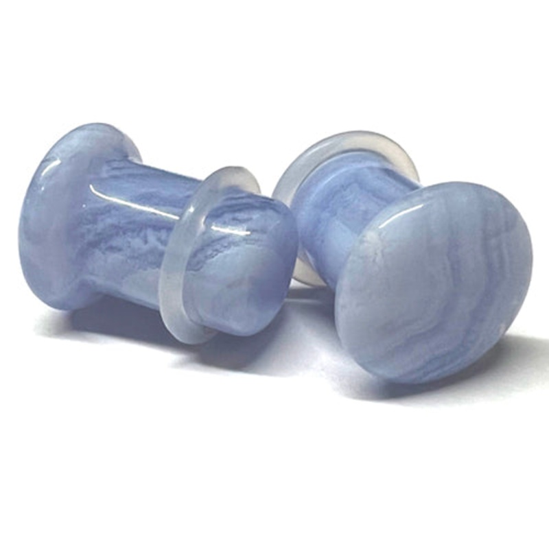 These single flare blue lace agate plugs have a wearable area of 3/8" between the o-ring and flare. Two clear silicone o-rings are included. Choose your size below.[click here for replacement o-rings]