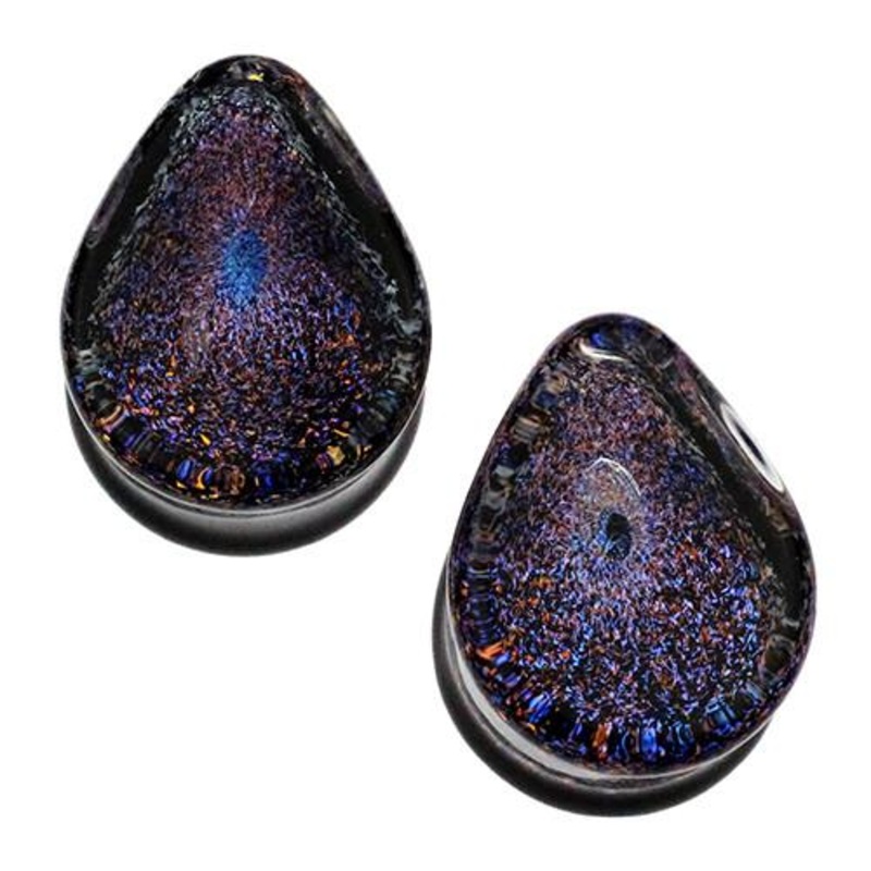 These double flare blue orange double galaxy teardrop plugs are made from hand blown borosilicate glass by Glasswear Studios. They have a wearable area of approximately 3/8" between flares. Choose your size below.