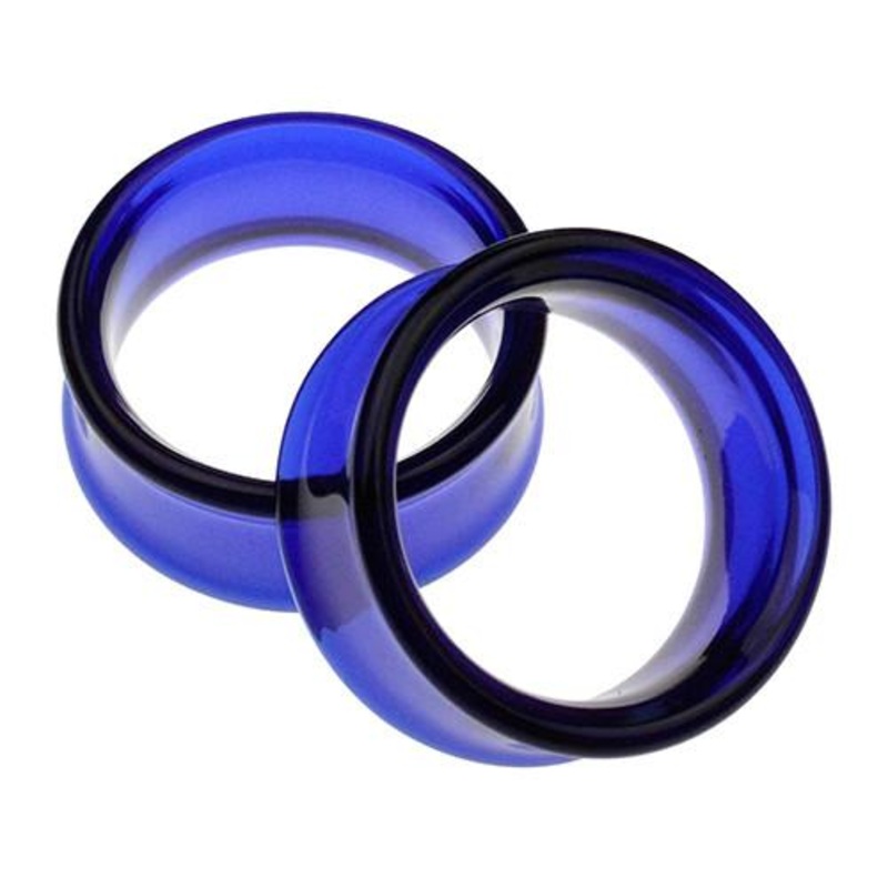 These double flare blue tunnels are made from hand blown borosilicate glass by Glasswear Studios. They have a wearable area of approximately 1/2″ between flares. Choose your size below.