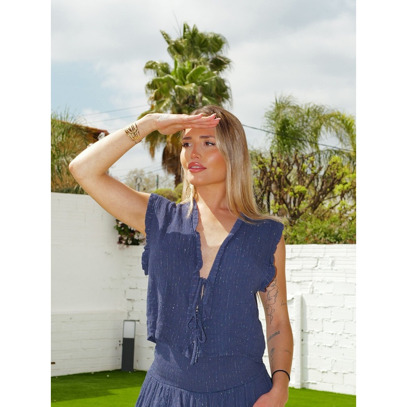 Blusa sin mangas con volantes en los hombros y parte delantera atada con lazos en el pecho y abdomen.