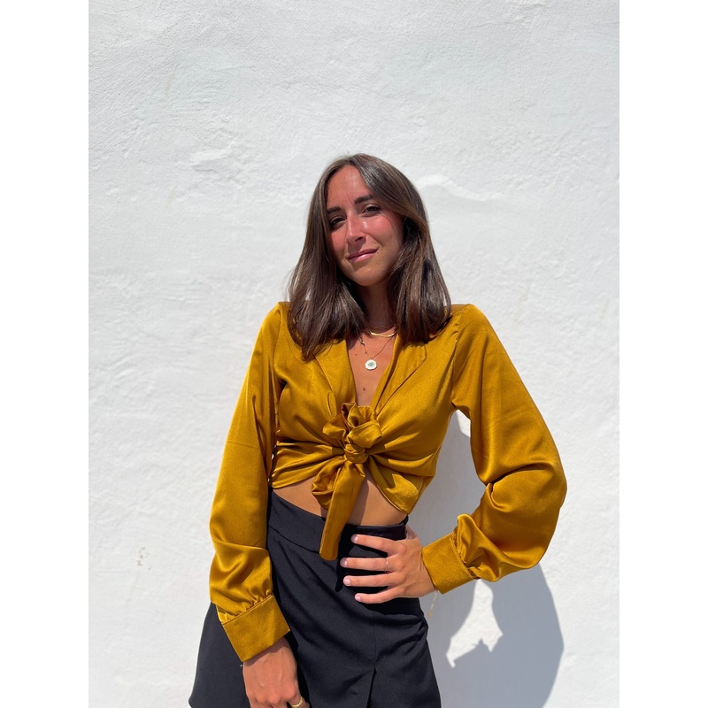 Blusa tipo camisa de manga larga con cuello solapa, escote pico y cierre con lazada delantera. Tejido raso. Detalle de botonadura en las mangas.Talla nica (sirve desde la 32 hasta la 38)Modelo: Altura 171 cm, Pecho 90 cm, Cintura 65 cm, Cadera 92 cm.Compos