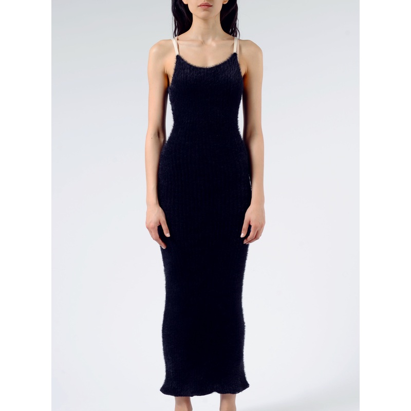 Long spaghetti-strap dress crafted in light furry knit with a ribbed effect. The snug style highlights the body in motion, a central theme of the collection.