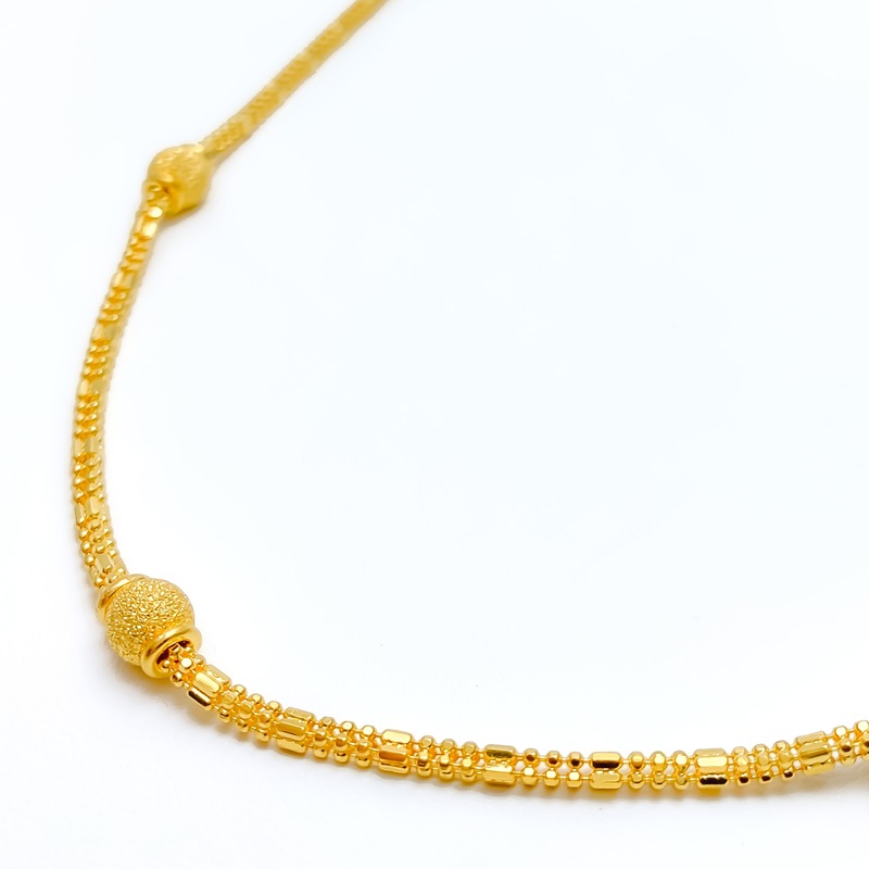 Expertly designed in radiant 22k yellow gold, this 25-inch chain weighs a substantial 20.5 grams and features an eye-catching alternating bead pattern for added visual interest. Its 2.5mm width offers a confident, statement-worthy profile without sacrifici