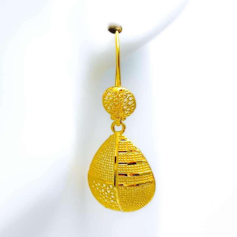 Crafted from 22k gold with a weight of 5.9 grams, these bold hanging earrings feature a textured yellow gold finish that catches the light with every movement. Measuring 1.75 inches in length, these earrings are designed with a hook back for easy wear. The
