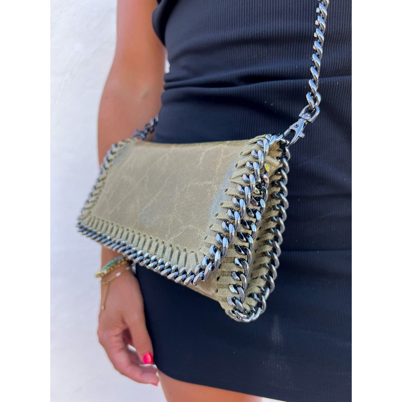Bolso bandolera de piel , correa de cadena y detalle de acabado plateado. Posibilidad de multiposicion, de forma cruzada o en el hombro. Cierre cremallera y bolsillo en interior.Material: Piel veganaMedidas: 23cm de ancho y 13 cm alto, profundidad 5 cm.Est
