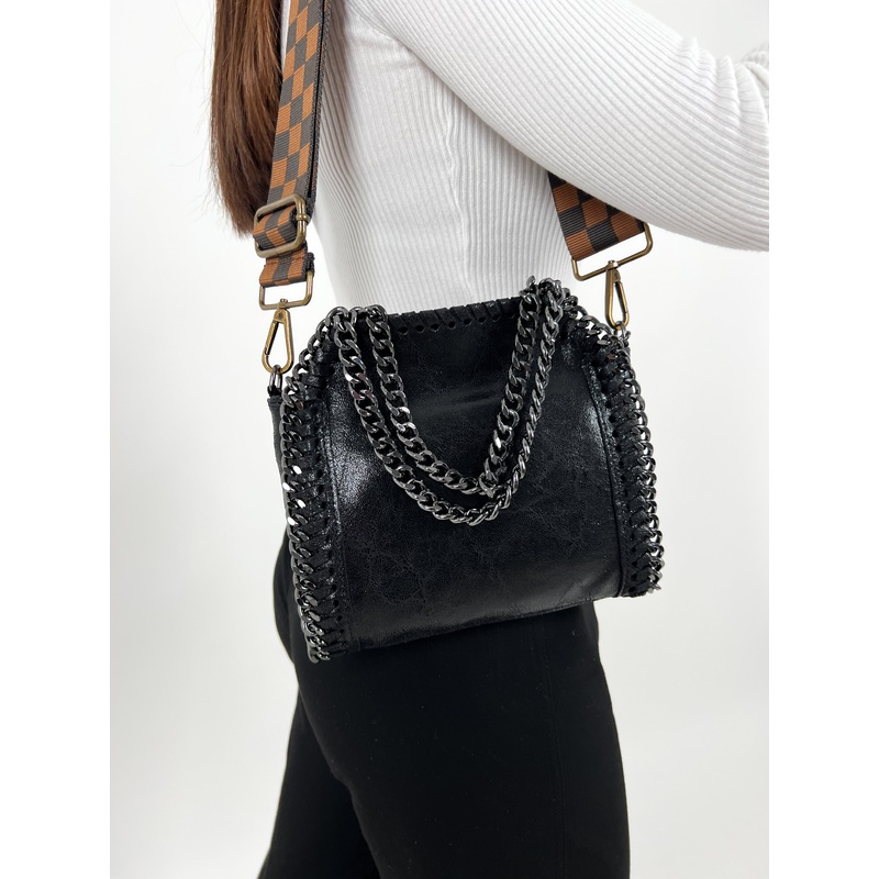 Bolso mini tipo bag de piel brillante, con detalle costura cadenas color plata oscura. Posibilidad de llevar tipo bandolera o de mano. Cadena metlica larga incluida.Material: Piel veganaMedidas: Ancho: 22 cm , alto: 20 cm , Profundidad: 6 cm.Este articulo