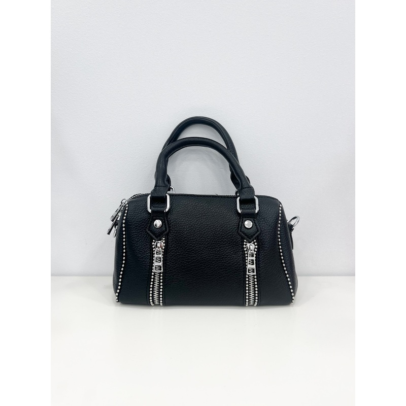 Bolso pequeo con asa de mano y asa larga en el interior para llevarlo colgado. Tiene cremalleras en la parte delantera y bolsillos en el interior.