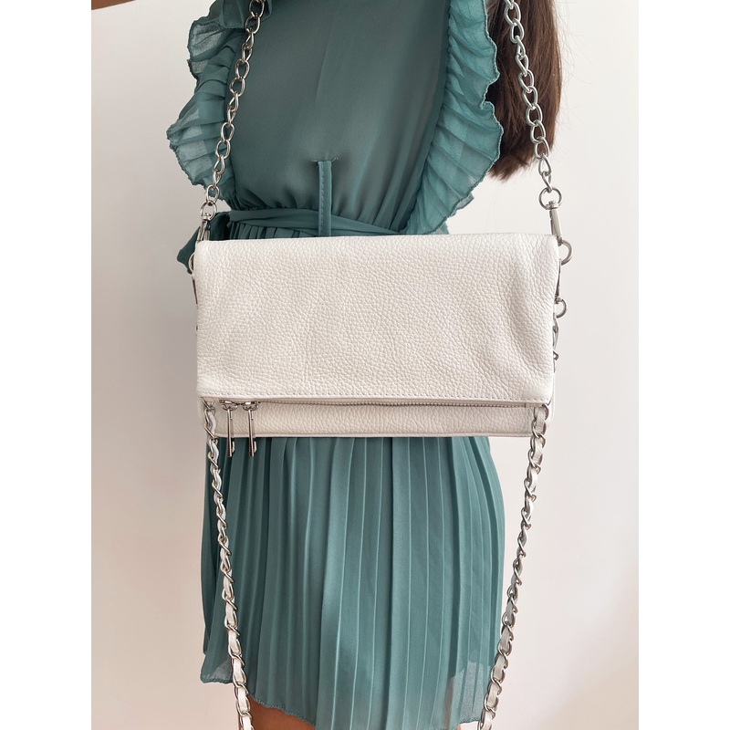 Bolso pequeo de piel, con dos cadenas extrables de metal color plateado entrelazadas con piel, bolsillo plano en la parte delantera, puede llevarse al hombro o cruzado en bandolera.Material: Piel veganaMedidas: 26cm de ancho y 15cm de alto.Este articulo es