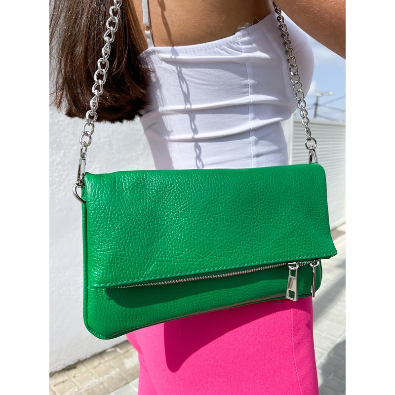 Bolso pequeo de piel, con dos cadenas extrables de metal color plateado entrelazadas con piel, bolsillo plano en la parte delantera, puede llevarse al hombro o cruzado en bandolera.