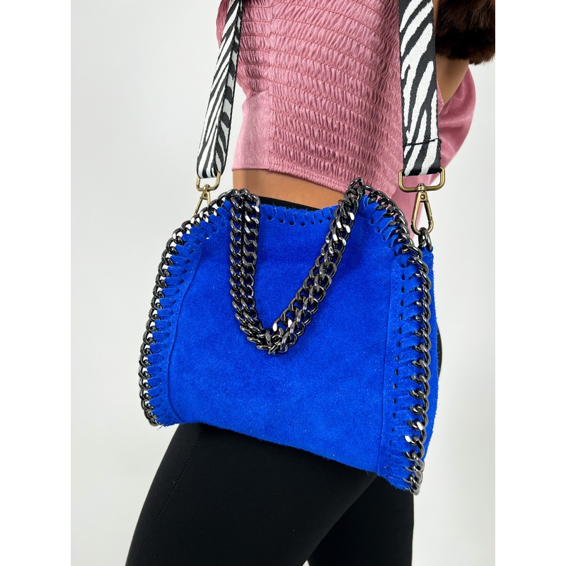 Bolso mini tipo bag de ante, con detalle costura cadenas color plata oscura. Posibilidad de llevar tipo bandolera o de mano. Cremallera en la parte de atrs. Cadena larga incluida.Material: Piel veganaMedidas: Ancho: 22 cm , alto: 20 cm , Profundidad: 6 cm.