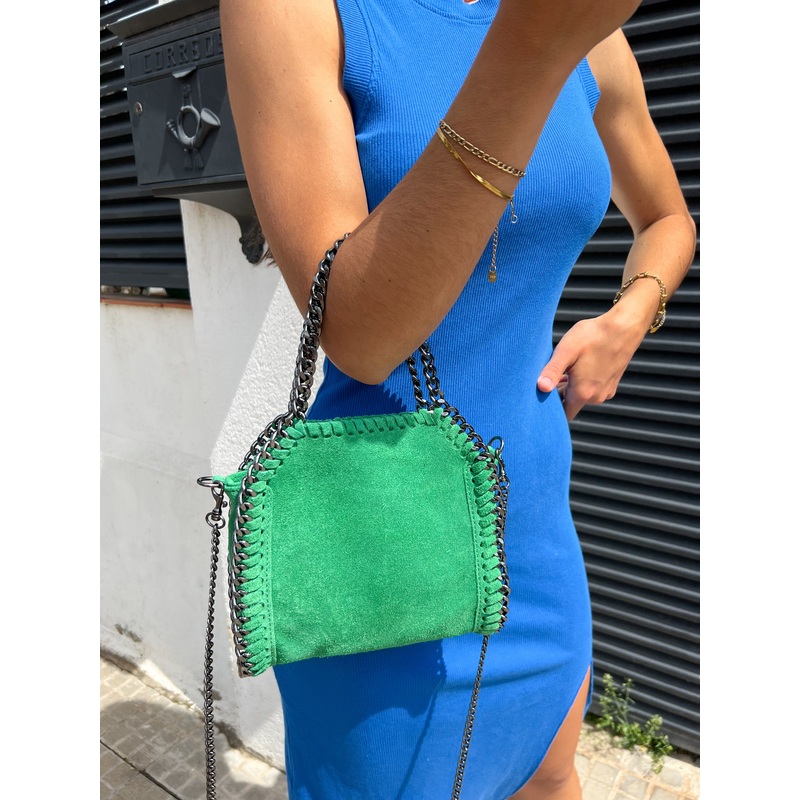 Bolso mini tipo bag de ante, con detalle costura cadenas color plata oscura. Posibilidad de llevar tipo bandolera o de mano.Cremallera en la parte de atrs. Cadena larga incluida.Material: Piel veganaMedidas: Ancho: 22 cm , alto: 20 cm , Profundidad: 6 cm.E