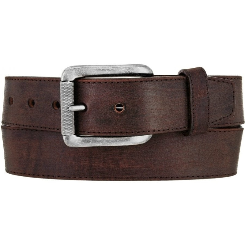This Justin belt is made from Latigo Leather from The Hide and Leather House in Napa, CA which is one of the worlds best tanneries. Boarded and sanded by artisans to give it a distressed look it is finished with a roller buckle embellished with subtle text