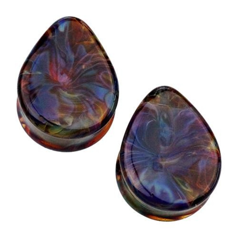 These double flare borostone teardrop plugs are made from hand blown borosilicate glass by Glasswear Studios. They have a wearable area of approximately 3/8" between flares. Choose your size and color below.