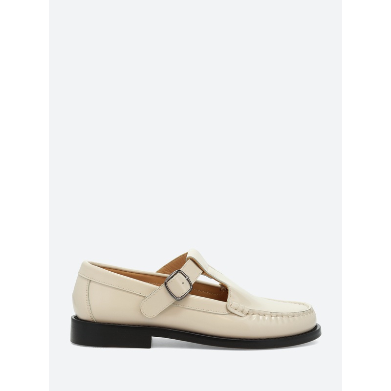 T-strap loafer in a soft calf leather. Hand sewn uppers with a round toe and adjustable buckle. Leather lined and leather soles with a subtle stacked heel.Penny loaferSlip-on styleAdjustable buckle cross strapRound toeStacked heelMaterialsUpper: calf leath