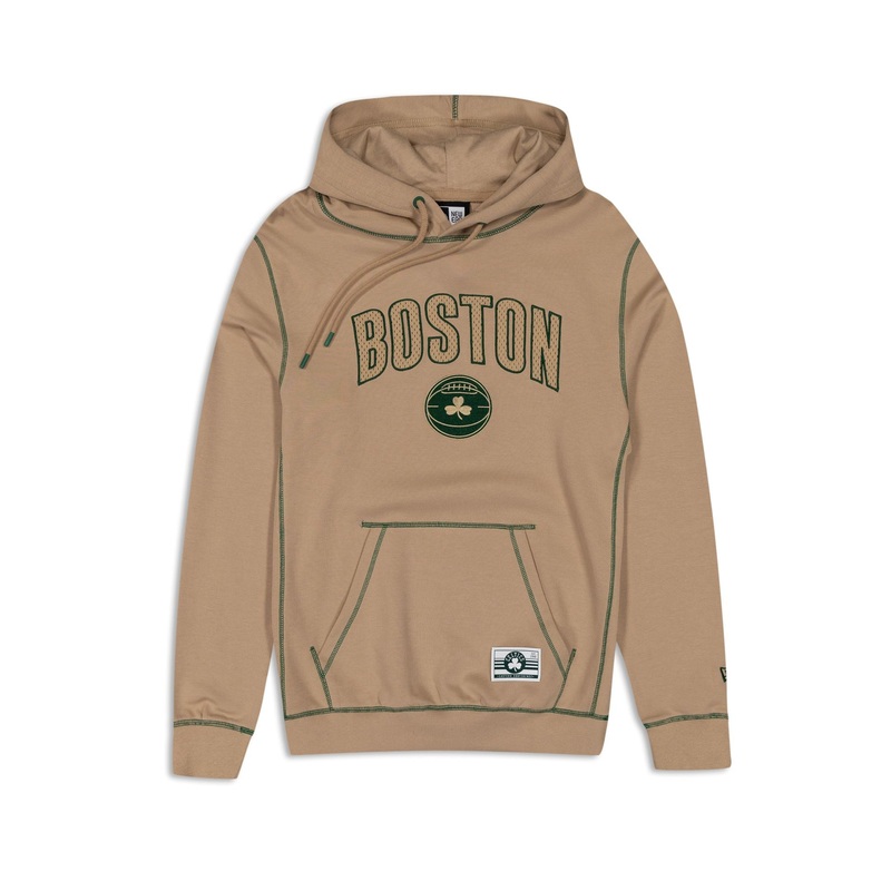 The Boston Celtics 2023 City Edition Tan Hoodie features a mesh applique Celtics wordmark and embroidered team logo at the chest with a team jock tag at the kangaroo pocket.