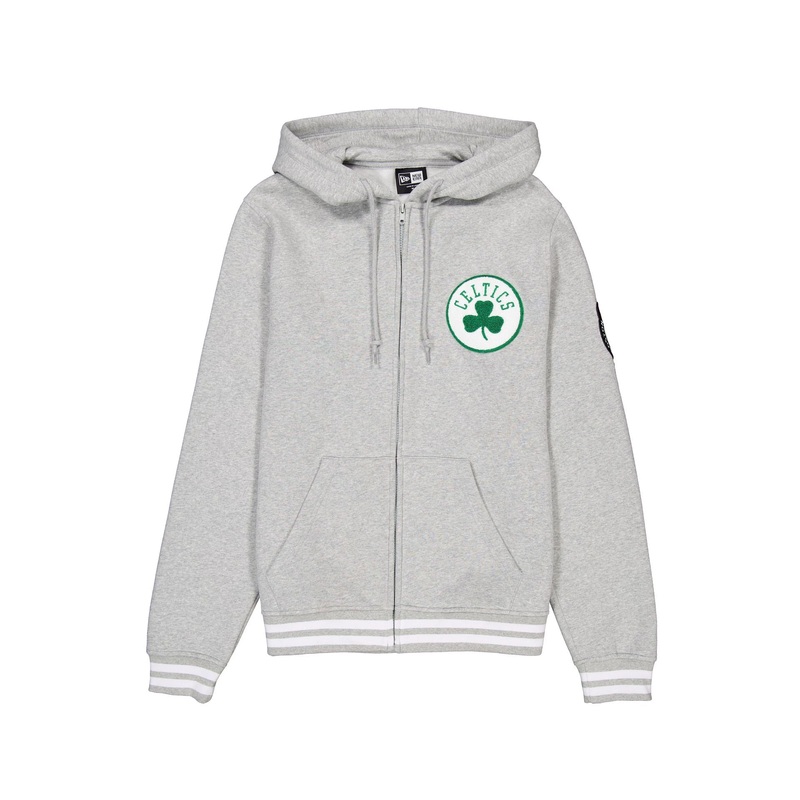 The Boston Celtics Gray Logo Select Full-Zip Hoodie features a chenille applique Celtics logo at the left chest with an alternate team logo patch embroidered at the left arm.