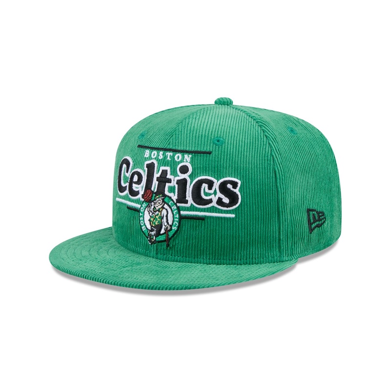 The Boston Celtics Throwback Display 9FIFTY Snapback Cap features an embroidered Celtics wordmark and logo at the front against a corduroy fabrication throughout. Additional details include a snapback closure at the rear and a gray undervisor.