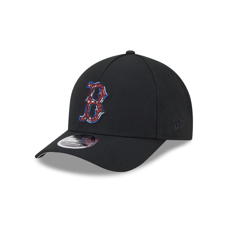 The Boston Red Sox Stained Glass 9FORTY M-Crown A-Frame Snapback features an embroidered Red Sox themed logo at the front with matching team wordmarks at a snapback closure at the rear and a gray undervisor.