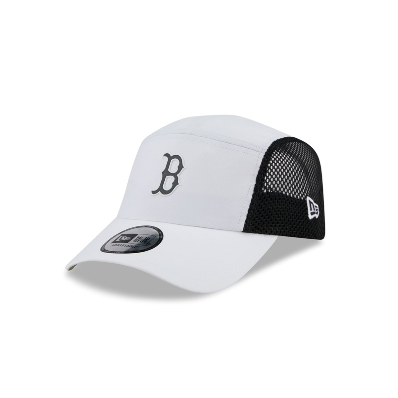 The Boston Red Sox White Poly Runner Cap features a heat sealed Red Sox logo at the front panels with mesh side panels. Additional details include a silicone patch above an adjustable drawstring closure at the rear.