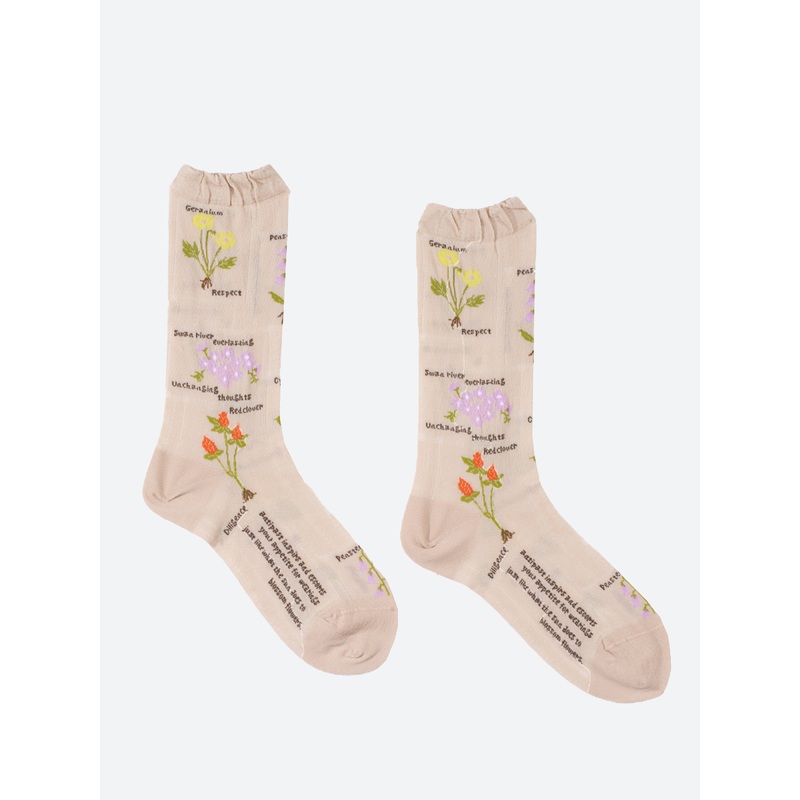 Antipast socks with irregular placed squares divided by ornate lines and filled with botanical illustrations of flowers.Elasticated cuffFloral patternBranding at baseMaterialsFabric Content: 70% cotton, 30% nylonMade in JapanSize GuideOne size fits most.Fo