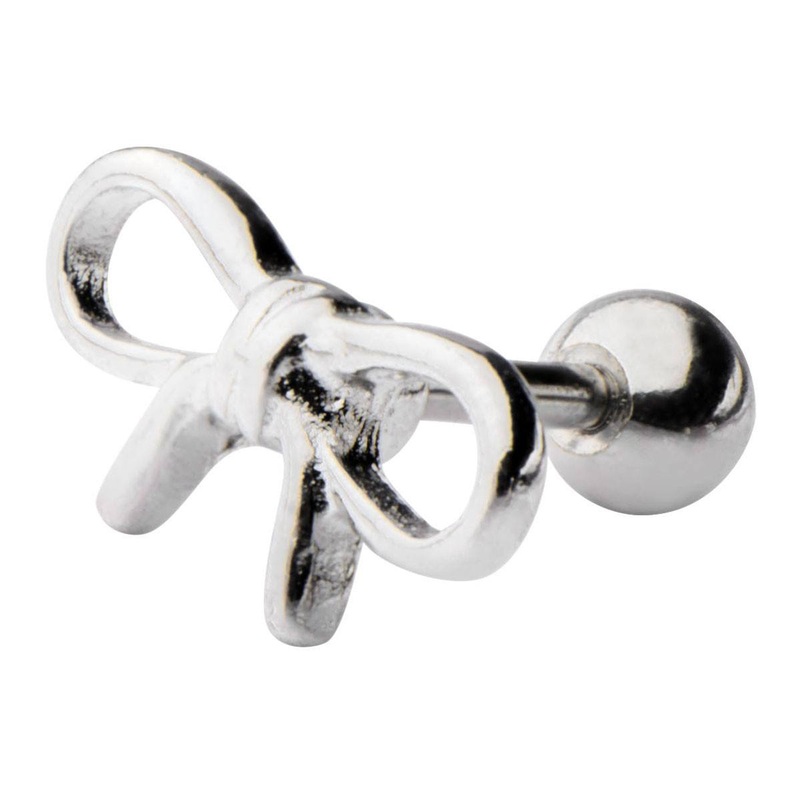 The 18 gauge bow cartilage barbell is made from externally threaded 316L stainless steel.
