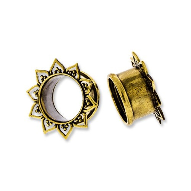 These double flare bali heart tunnels are made fromyellow brass. They have a wearable area of 5/16" between flares. Choose your size below.