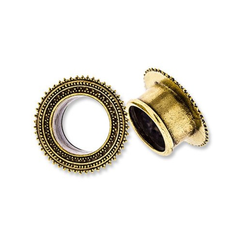 These double flare mayan tunnelsare made fromyellow brass. They have a wearable area of 5/16" between flares. Choose your size below.